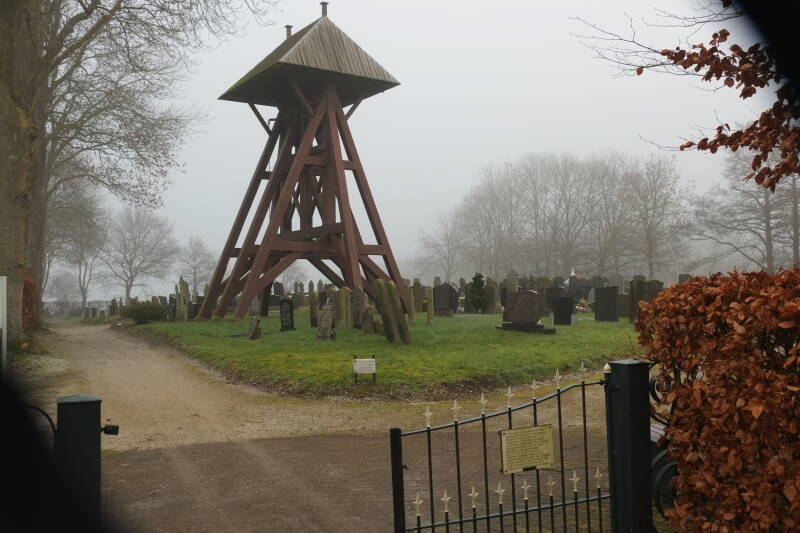 Foto van de ingang van de begraafplaats te Opeinde met de klokkenstoel. Op de verhoging rond de klokkenstoel stond tot 1906 de kerk. In 1906 is er een nieuwe kerk gebouwd richting de dorpskom van Opeinde.