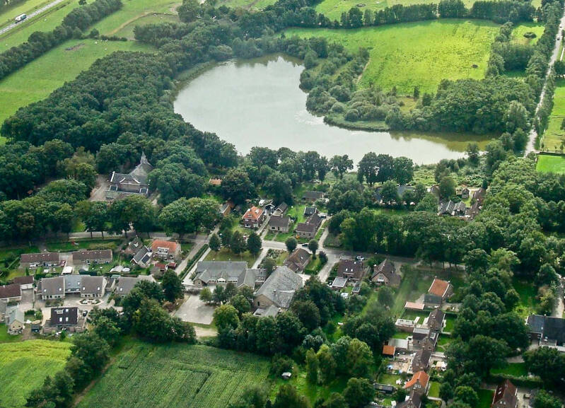 Luchtfoto van Berghuizen met op de achtergrond de Pingo ruïne (Het trekgat)